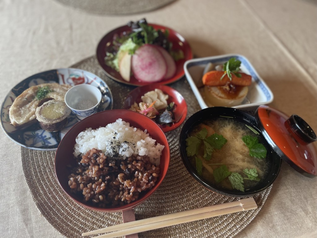 季節のお野菜とわのんの無農薬栽培のお米を使った酵素玄米と白米。オリジナル発酵調味料を使った、心身を整えてくれるお料理をじっくり味わっていただくための御膳。テーマは「農家のハレの日」をイメージして、明治〜江戸末期くらいの漆器や骨董の器でお召し上がりいただき、昔の日本人が大切にしていた余韻、余白をじっくり味わう豊かさを感じていただけます。